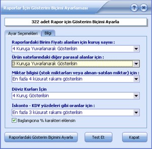 Bu aracı kullanarak, Satış Kaydı, Fatura vs.. gibi ürün satırları içeren raporlarda Birim Fiyatı ve ürün satırındaki diğer bilgilerin kaç kuruşlu (veya kaç küsurat haneli) yazdırılacağını belirleyip, belirlediğiniz gösterim biçiminin raporlara otomatik aktarılmasını kolayca sağlayabiliyorsunuz.