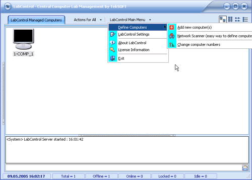 For the first use of the control menu, you can delete the computer 1-COMP_1 (assuming there is no computer with a name COMP_1 in your lab). To delete COMP_1, right click on it's icon and select "Computer Definition Related -> Delete this computer" from the popup menu. This is the way to delete a computer from LabControl list.